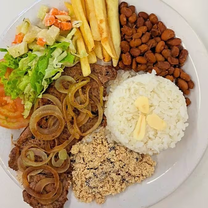Deliciosa marmita 500g contendo Iscas de boi acebolado, perfeitamente temperado levemente caramelizadas, acompanhado de crocantes batatas fritas. Acompanha também um arroz soltinho e bem temperado, feijão temperado com alho e sal, uma farofa crocante e saborosa. Para finaliza e maionese. Tudo preparado com muito carinho e ingredientes de alta qualidade. Marmita com aproximadamente (500 gramas)