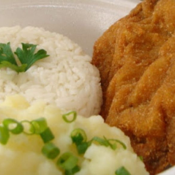 Marmita com 500g, file de frango a milanesa, arroz, feijão e pure de batatas