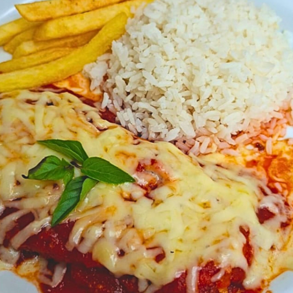 Parmegiana de Frango do jeitinho que você ama 500g!Filé de frango empanado, crocante por fora e macio por dentro, coberto com muito molho de tomate caseiro e queijo gratinado no ponto certo. Acompanha arroz soltinho, salada de maionese, batata frita crocante para completar essa explosão de sabor!