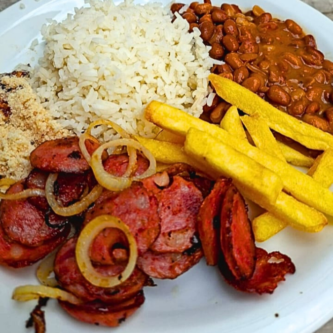 Marmita com 500g linguiça calabresa acebolada, arroz branco soltinho, feijão, farofa crocante, batata frita, maionese.