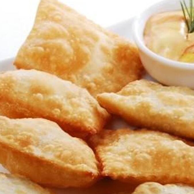 Massa de angu frito recheado de queijo e orégano. 10 un.