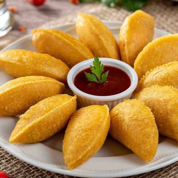 Massa de angú frito com recheio de carne moída. 10 un