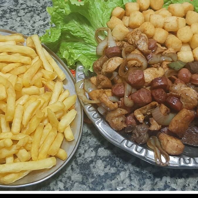3 med de frango + 2 boi + 1 coracao+ 2 paes de alho + coca 2 litros +2 Brahma ou Skol latao+ farofa gratis