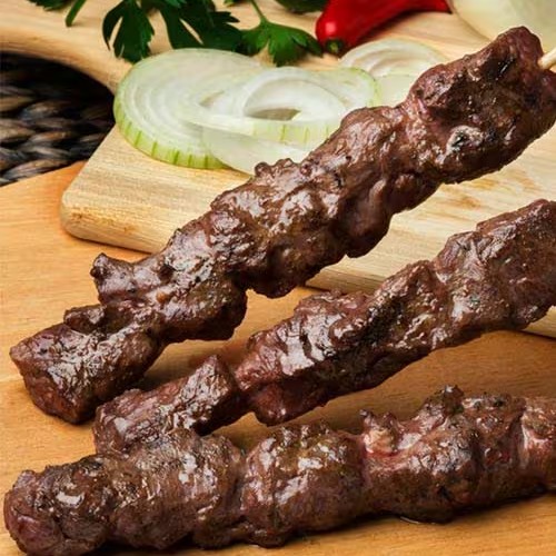 Cubos de carne bovina e lombo de porco com fatias de cebola, pimentão e tomate.