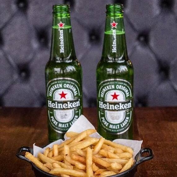 Na compra de 5 Heineken long neck voce ganha 1 porção de fritas e um pão de alho