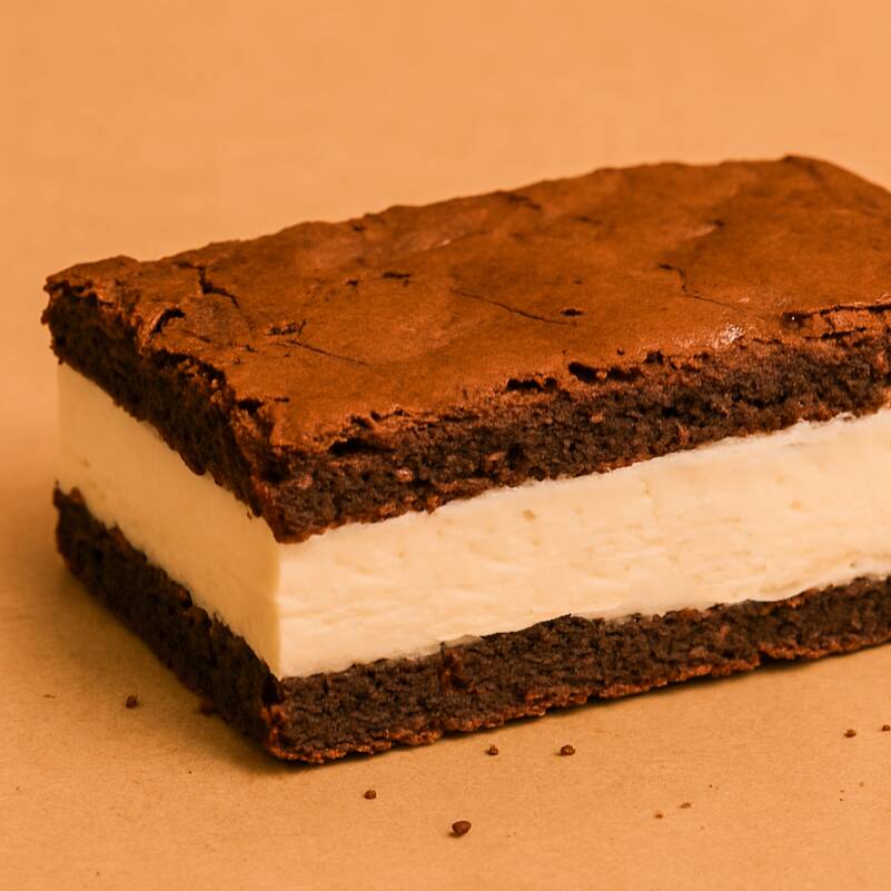 inspirado no "ice cream sandwich" das gringas, ele é feito com o nosso brownie, com pedaços de chocolate, recheado com uma adaptação mais cremosa e congelada do recheio do Delírio (creme de baunilha)! Deve ser mantido congelado! [130g]