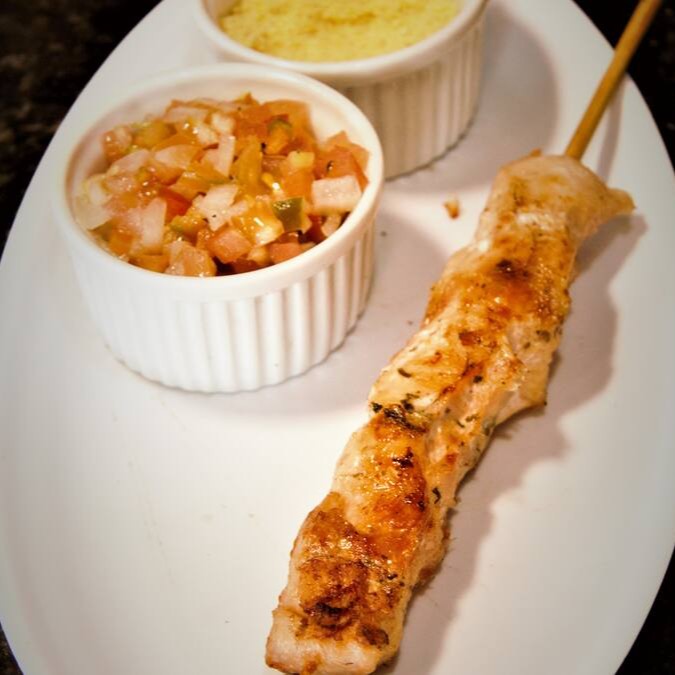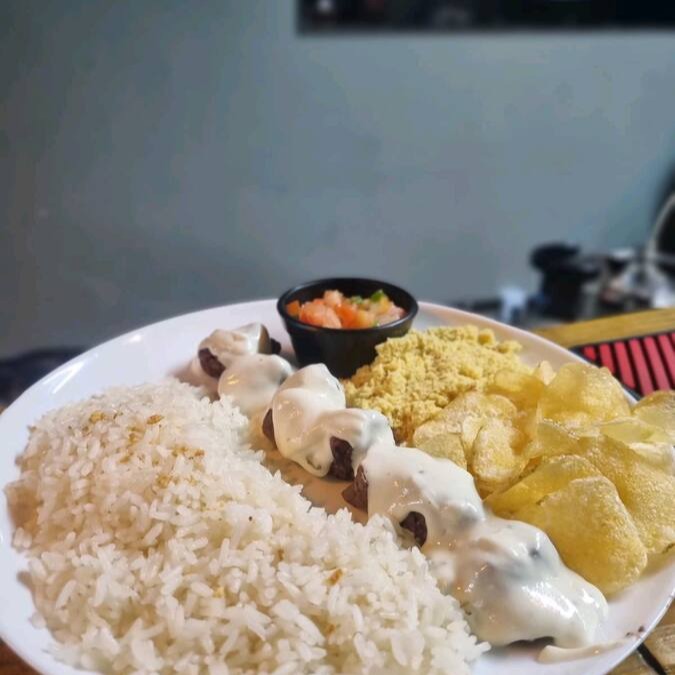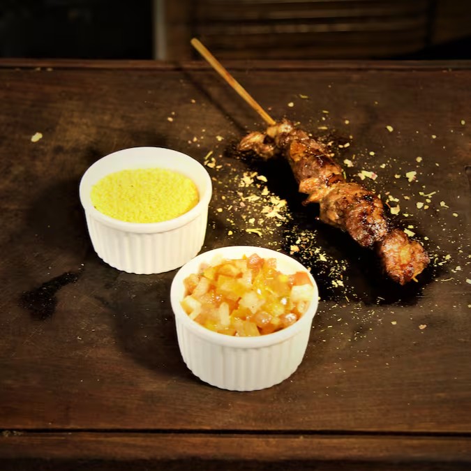 Só escolher seu espeto favorito e junto acompanha arroz branquinho e soltinho, farofa da casa, vinagrete fresquinho, feijão carioca refogado ao alho, salada da casa e batata chips super crocante. A parte vai a batata, feijão e vinagrete pra ficar ainda melhor.