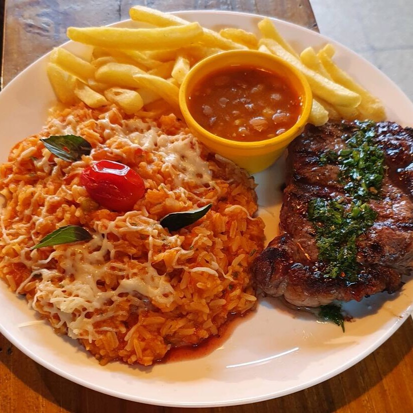 Delicioso corte bovino, macio e suculento feito na brasa finalizado com sal de parrilla e nosso chimichurry feito na casa com ervas frescas! Acompanha arroz cremoso ao molho pomodoro(molho de tomate caseiro envolvido com tomate cereja, manjericão e queijo mussarela), batata frita e salada do Dia super variada. Peça logo o seu!!