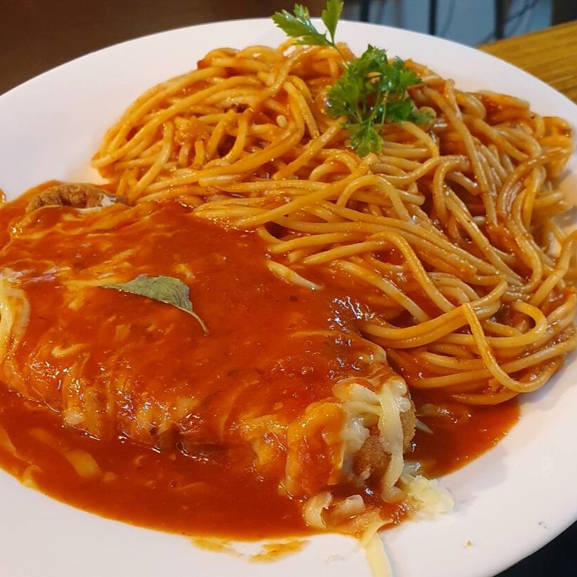 Delicioso parmegiana coberto com molho de tomate caseiro feito na brasa e finalizado com queijo mussarela. Acompanha nosso espaguete "al dente" também envolvido em nosso maravilhoso molho de tomate. Está esperando o que? Faça logo seu pedido.