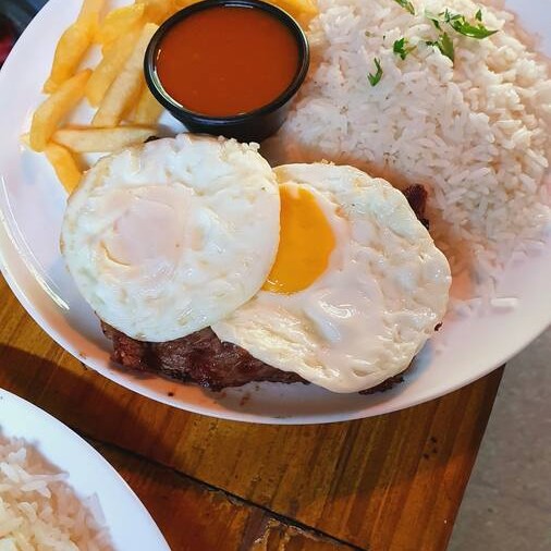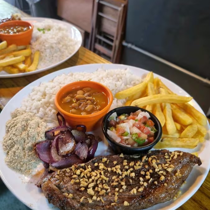 Delicioso corte bovino, macio e suculento feito na brasa finalizado com sal de parrilla. Acompanha 2 ovos, arroz branquinho, feijão refogado ao alho, batata frita e salada do Dia super variada. Peça logo o seu.