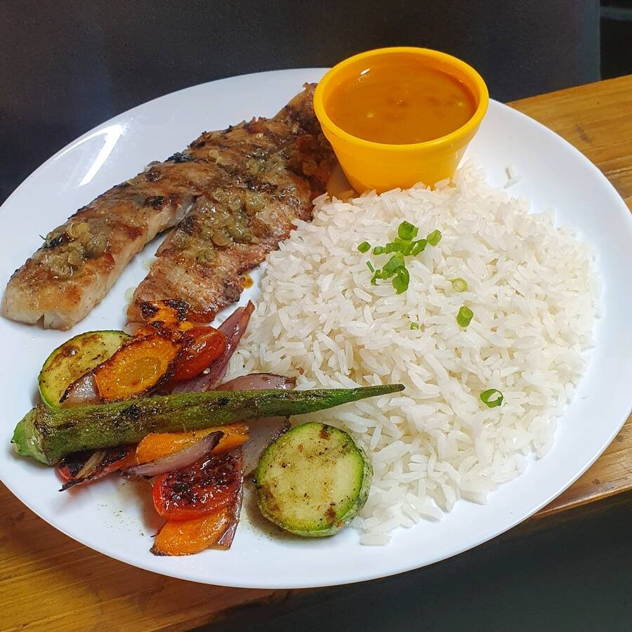Delicioso filé de tilápia selecionado com molho de alcaparras acompanhado de arroz branquinho e soltinho, legumes variados do Dia na brasa e feijão carioca refogado ao alho!! Feijão vai separado. Se quiser dar um up peça nossa deliciosa salada super variada do Dia com molho da casa, esse vai a parte para ficar ainda melhor!