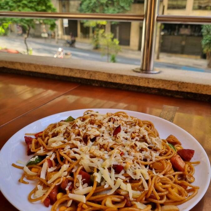 Delicioso espaguete na chapa muitooo recheado com bacon, calabresa, frango, milho, tomate, mix de pimentões, cebola e shoyo finalizado com mussarela!! São mais de 500 grs de muito sabor!! Peça já o seu!!