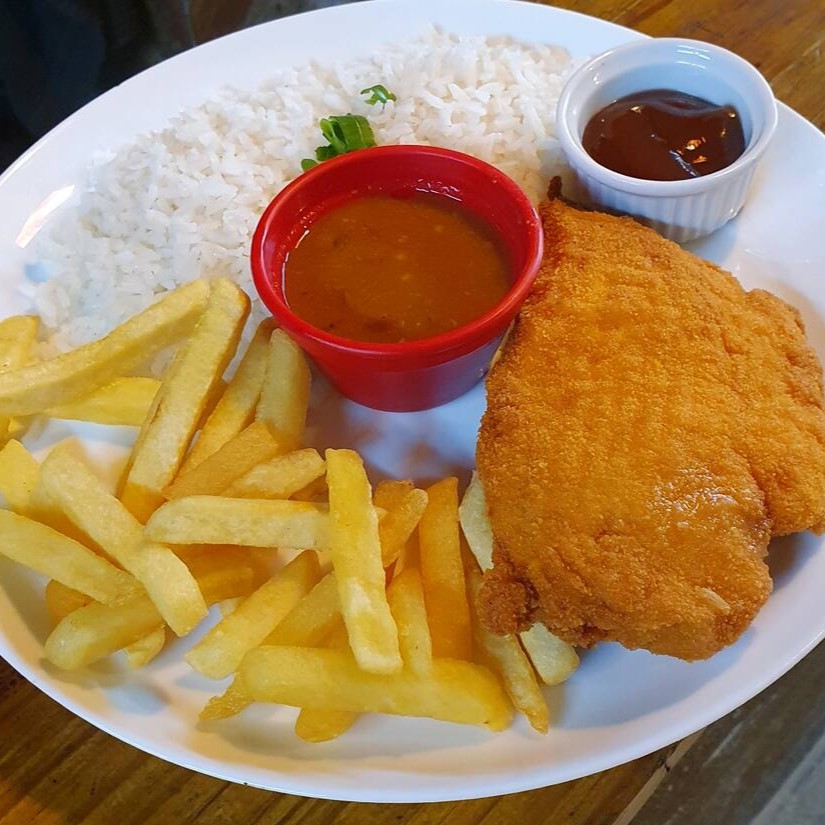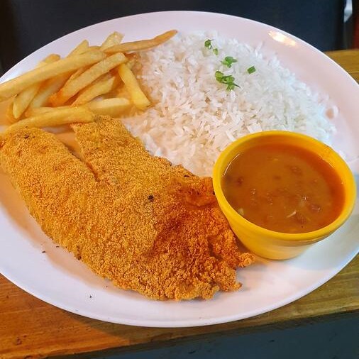 Delicioso filé de tilápia selecionado crocante empanado na farinha especial acompanhado de arroz branquinho e soltinho, batata frita e feijão carioca refogado ao alho!! Feijão vai separado. Se quiser dar um up peça nossa deliciosa salada super variada do Dia com molho da casa, esse vai a parte para ficar ainda melhor!