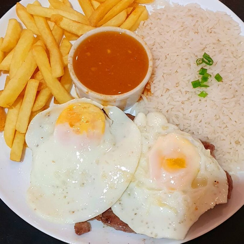 Delicioso bife ancho acompanhado de 2 ovos fritos, arroz branquinho e soltinho, batata frita e feijão carioca refogado ao alho!! Se quiser dar um up peça nossa deliciosa salada super variada do Dia com molho da casa, esse vai a parte para ficar ainda melhor!