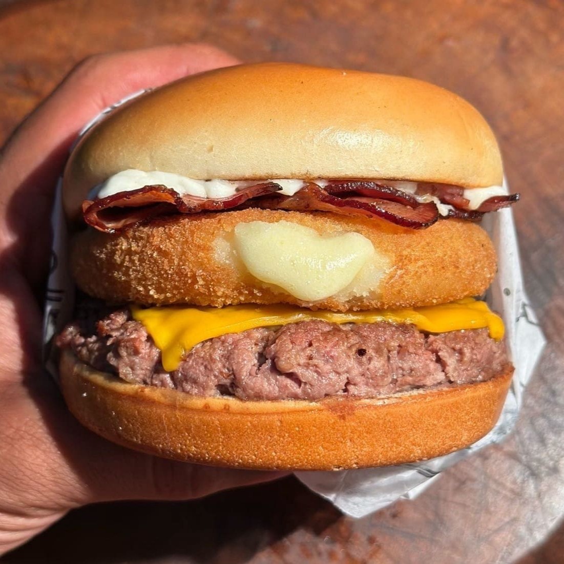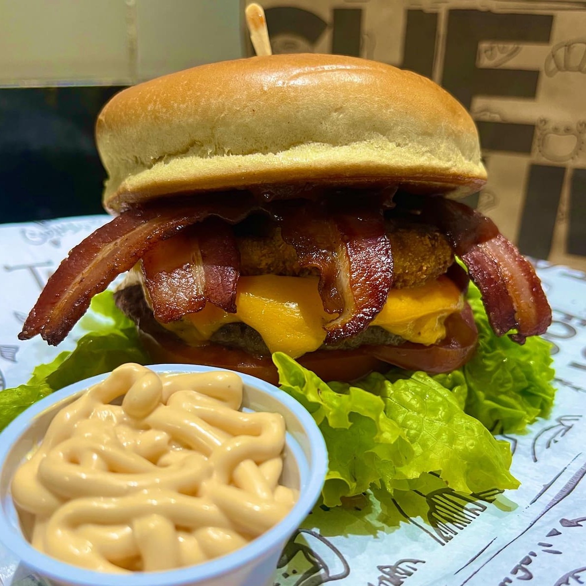 Explosão de sabor! Conta com Duas Deliciosas Carnes de hambúrguer Artesanal, Pão Tostado na manteiga, Bacon, Molho Cremoso Cheddar, Tomates Frecos em rodela e Molho Cremoso de Bacon! #saborqueapaixona #hamburguerartesanal #Explosaoqueapaixona