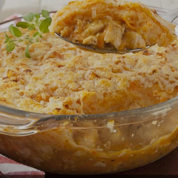 Delicioso escondidinho de frango com molho branco, acompanha arroz branco soltinho e um delicioso feijão, salada fresca e crocante, servido em Marmitex grande,ainda ganhe 1 delicioso bombom de sobremesa para complementar essa refeição deliciosa.