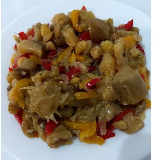 BERINJELA AZEITE PIMENTÕES COLORIDO CEBOLA E PASSAS