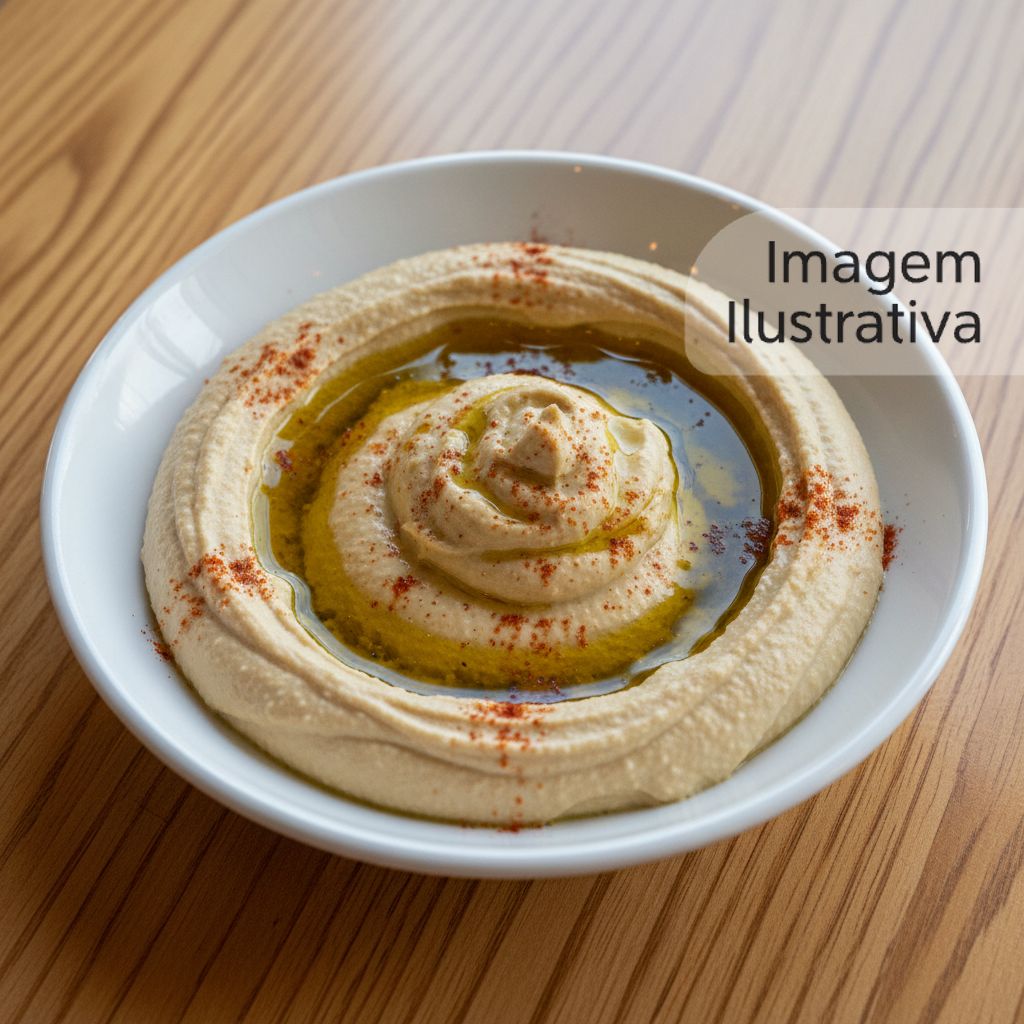 Um delicioso hummus cremoso feito com grão-de-bico fresco e tahine, temperado com limão e alho.