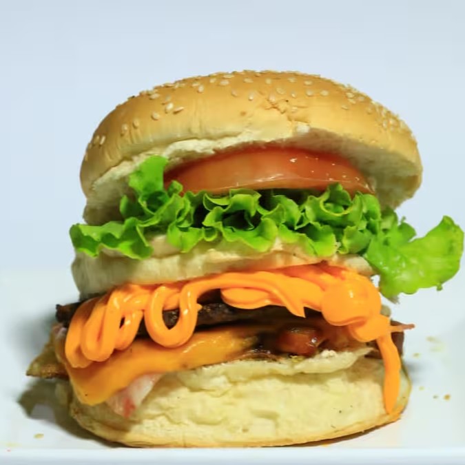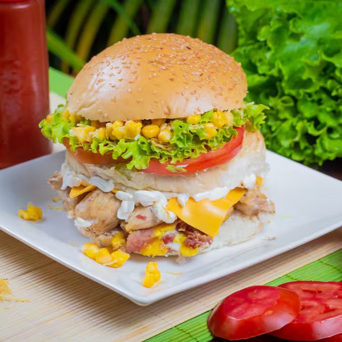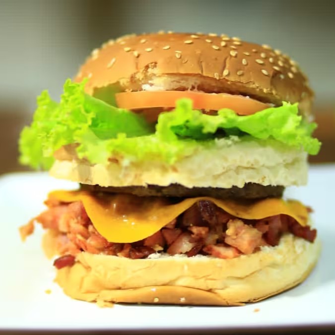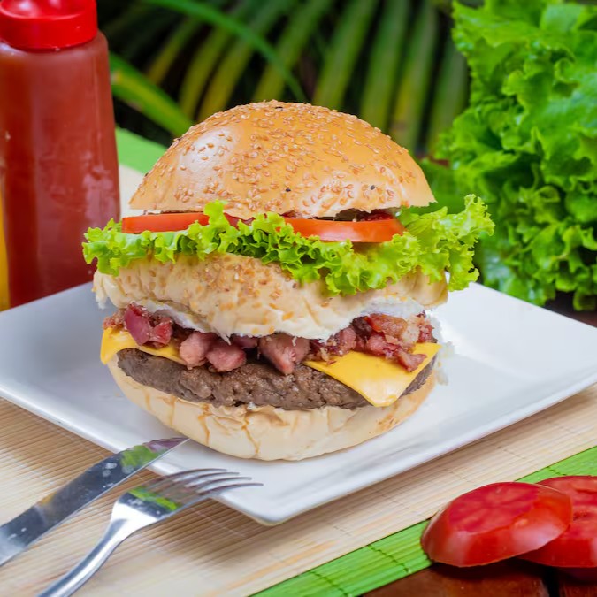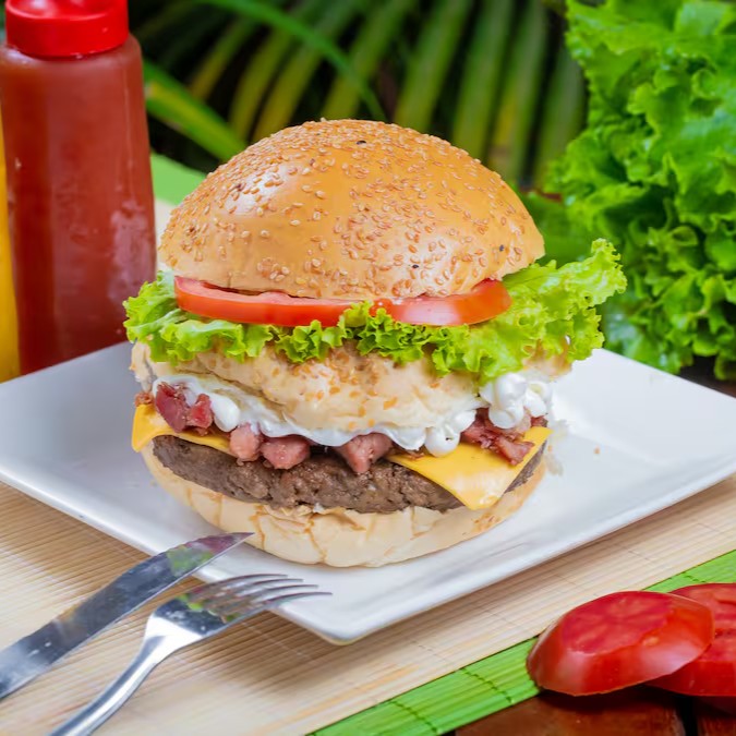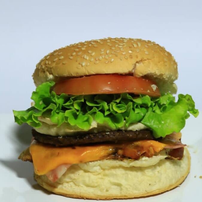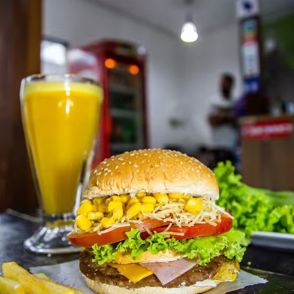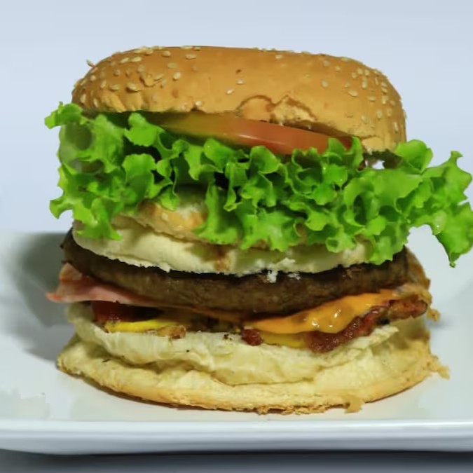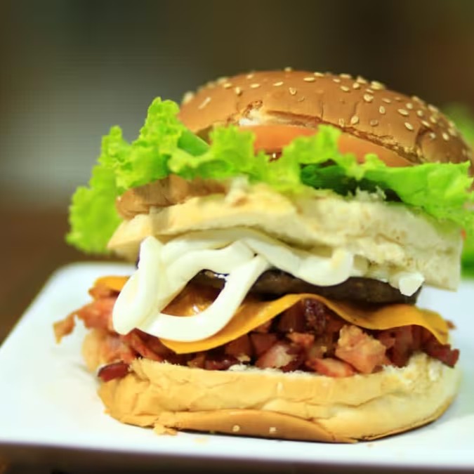 Pão c/gergelin , hambúrguer, generosa porçao de bacon , queijo prato saboroso, alface, tomate, milho, batata palha e o poderoso molho especial da casa .
