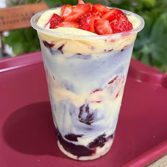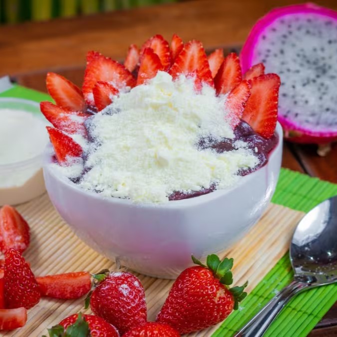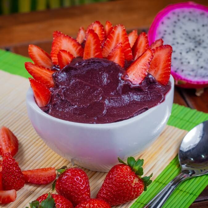 Delicioso açaí , vai acompanhado de morango picado e leite Ninho , opção bem saudável .