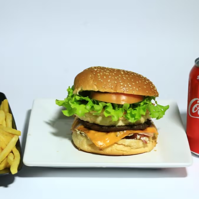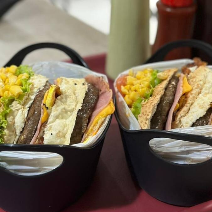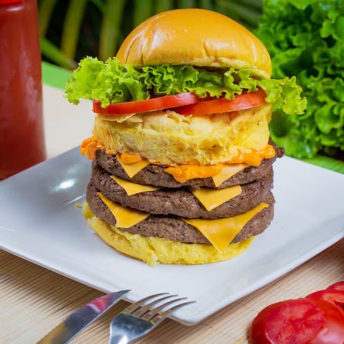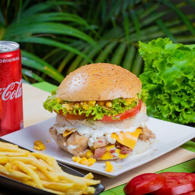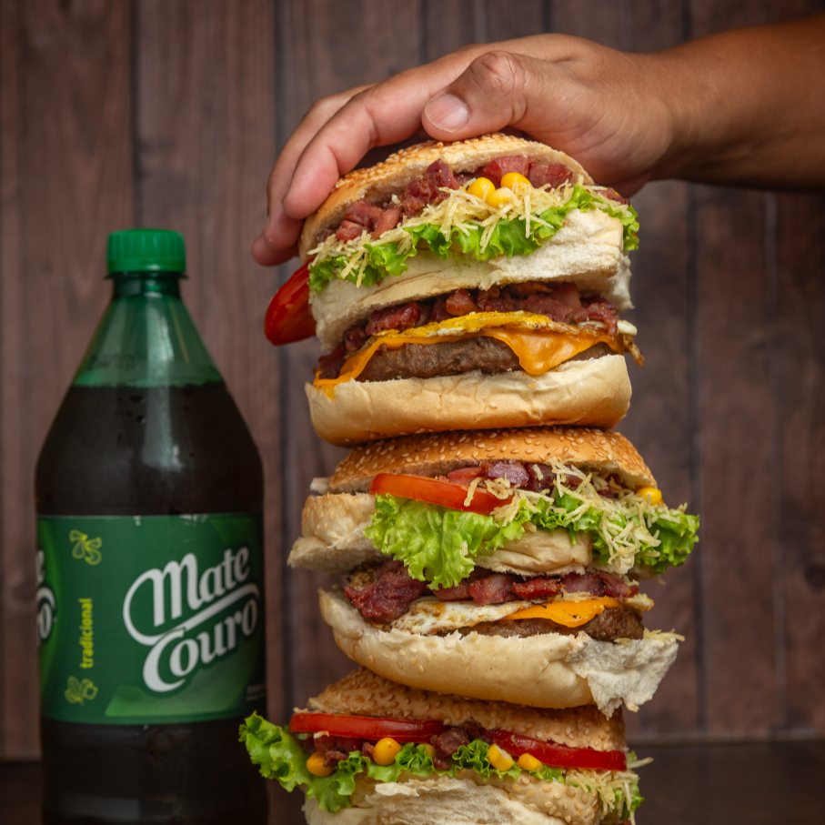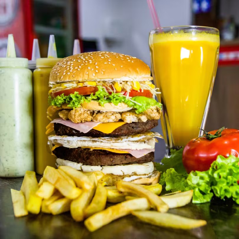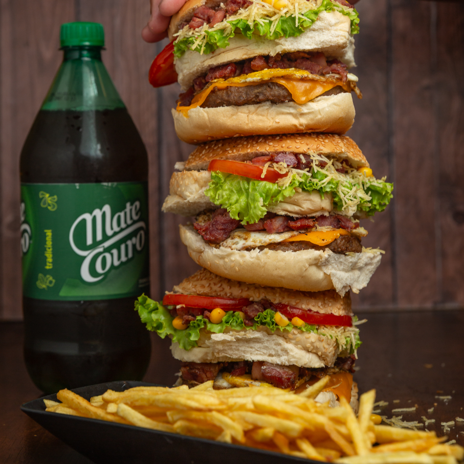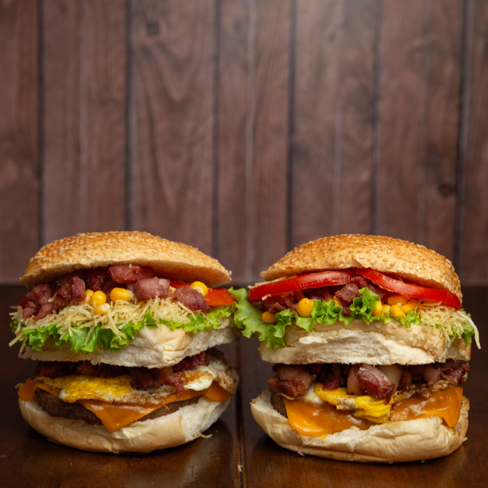 2 hambúrgueres de picanha 120g, Catupiry, 2 ovos, 2 queijos, 2 presuntos, bacon, alface, tomate, milho, batata palha e molho especial.