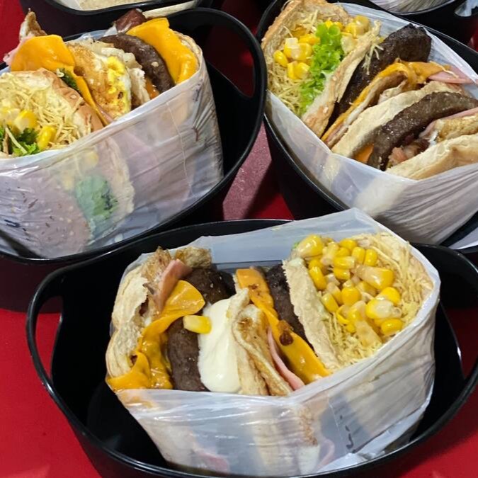 Pão c/ gergelim , hambúrguer, Catupiry ou cheddar, ovo, bacon, presunto, queijo, alface, tomate, milho, batata palha e molho especial.