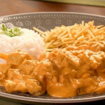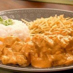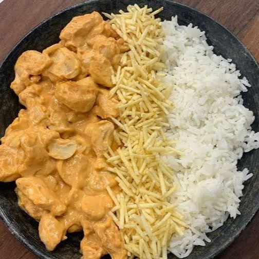 Acompanha arroz branco, delicioso strogonoff de frango com milho, batata palha e cheiro verde.