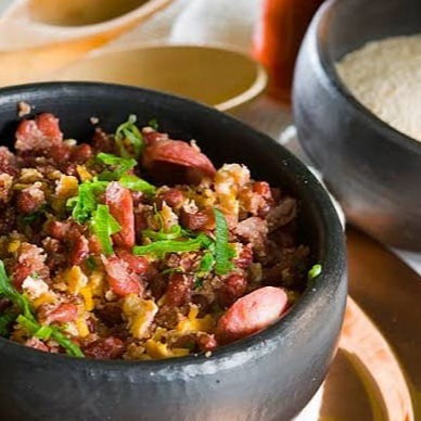 Uma mistura gostosa e caseira feita (com arroz, feijão, farinha mandioca, pernil, linguiça calabresa, torresmo, ovo frito, couve e cheiro verde)