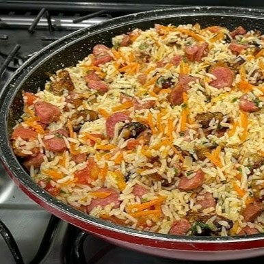 Delicioso arroz na chapa, com frango picadinho, linguiça calabresa, cenoura ralada, cebola, milho e cheiro verde. Uma delícia feito na chapa.