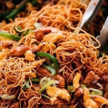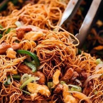 Delicioso Espaguete, linguiça calabresa picadinha, pernil grelhado pedaços , cenoura ralada, pimentão, cebola, milho e molho Shoyo.