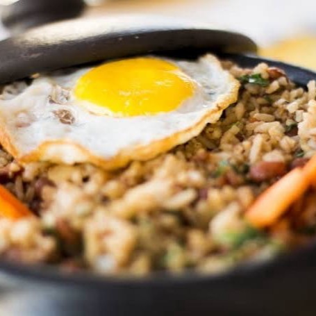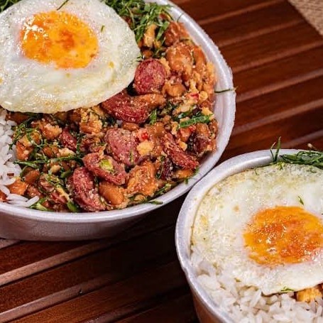Acompanha delicioso arroz na chapa com frango, linguiça calabresa picadinha, milho, cenoura ralada, cebola, cheiro verde, molho shoyu.