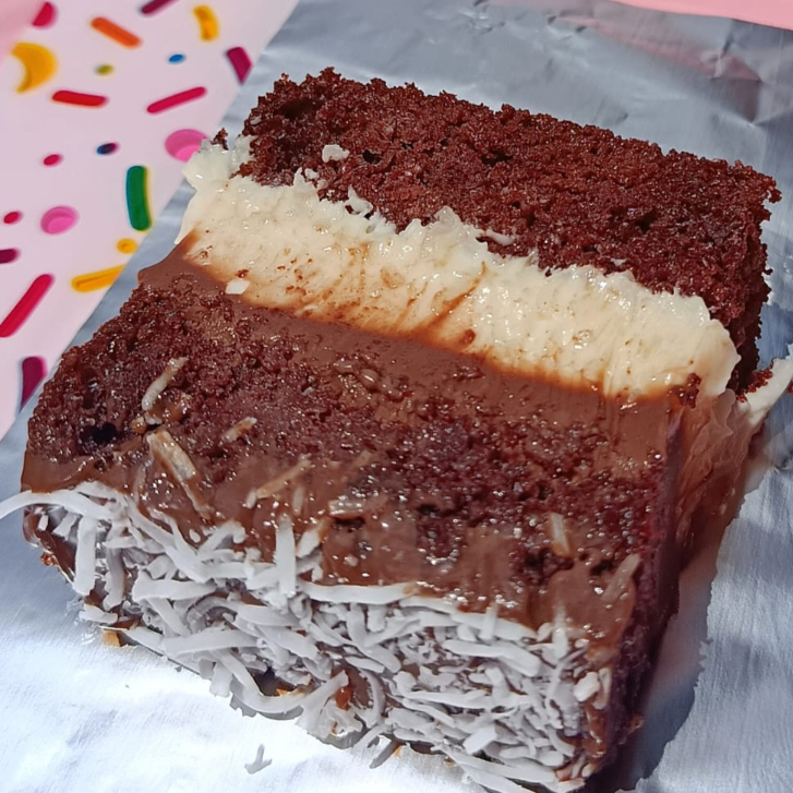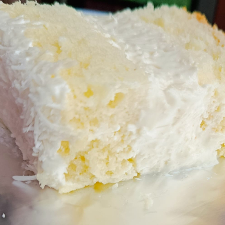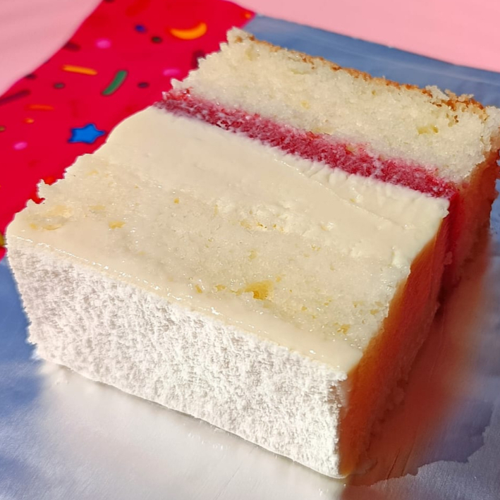 Massa branca fofinha e bem molhadinha, uma camada de recheio cremoso de Ninho, uma camada de geleia de morango, finalizado com creme de Ninho.