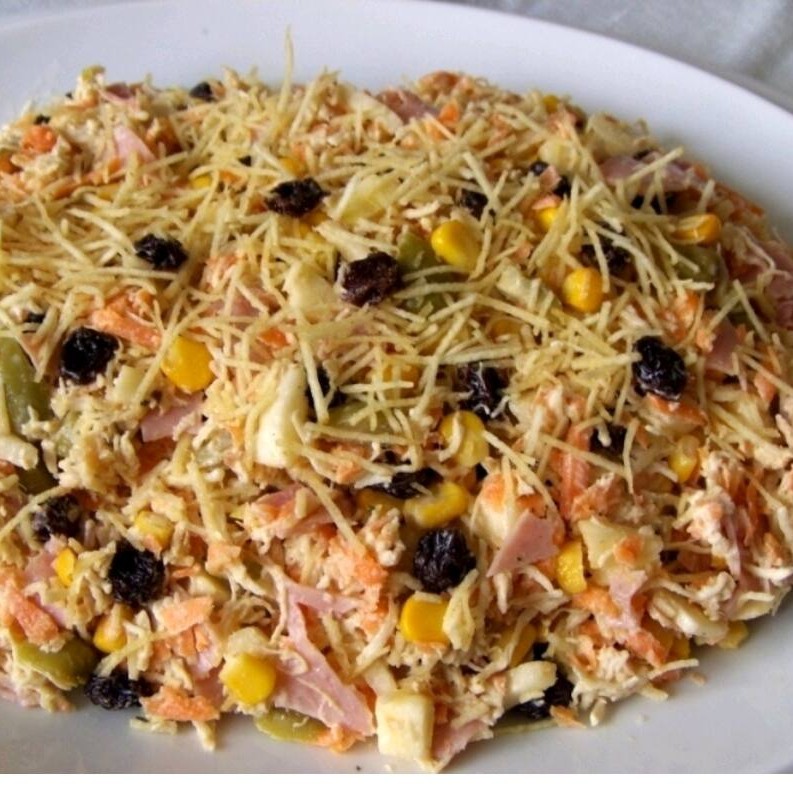 Vargem,peito de frango desfiado, uvas passa,azeitona,milho. Maionese tudo feito na hora. 500 gramas