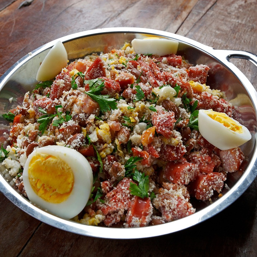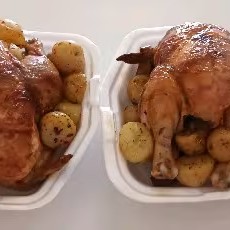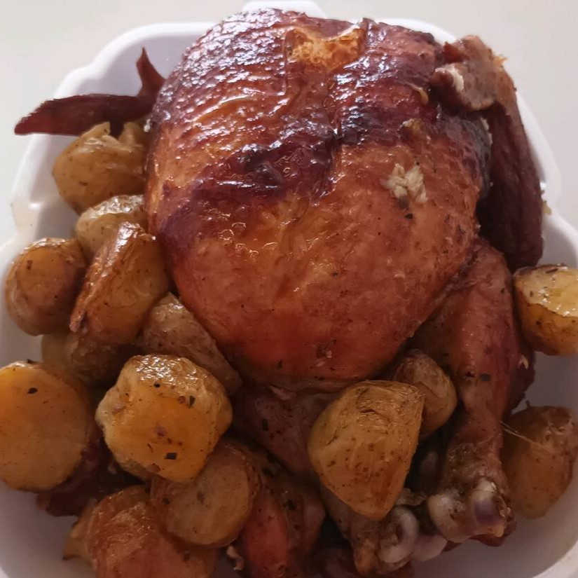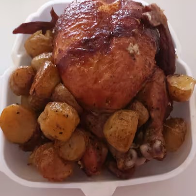 Um frango assado no ponto, picado com batatas assadas temperadas com ervas finas, tropeiro marmitex G feito com farinha de milho,linguiça calabresa, bacon, e ovos cozidos , torresmo feito na hora, e cebolinha.