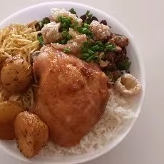 Arroz, feijão tropeiro feito com farinha de milho, salpicão com batata palha, batatas que vem no frango já temperadas com ervas finas, e um pedaço de frango da sua escola.