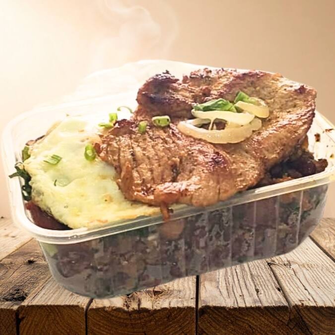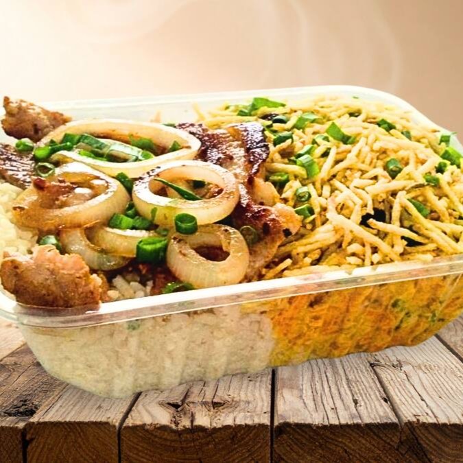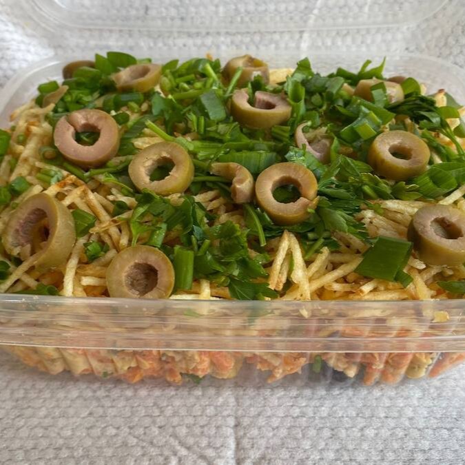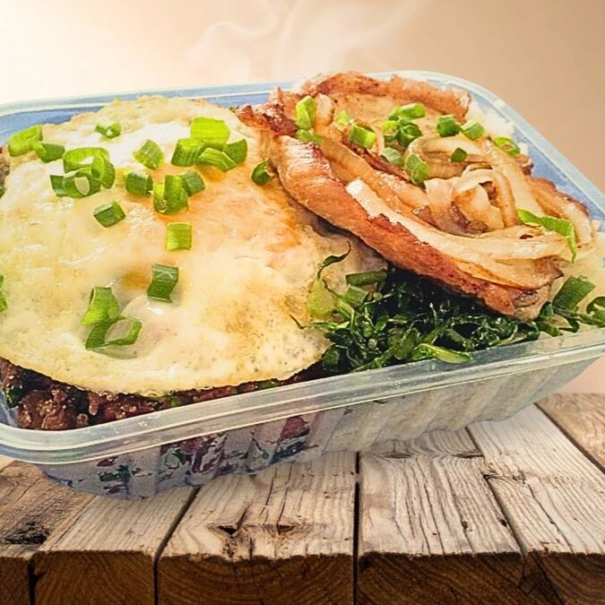 Saboreie um delicioso salpicão preparado com ingredientes frescos e de alta qualidade, acompanhado de arroz e suculento bife de pernil. Este prato é uma combinação perfeita de texturas e sabores, ideal para uma refeição completa e satisfatória.
