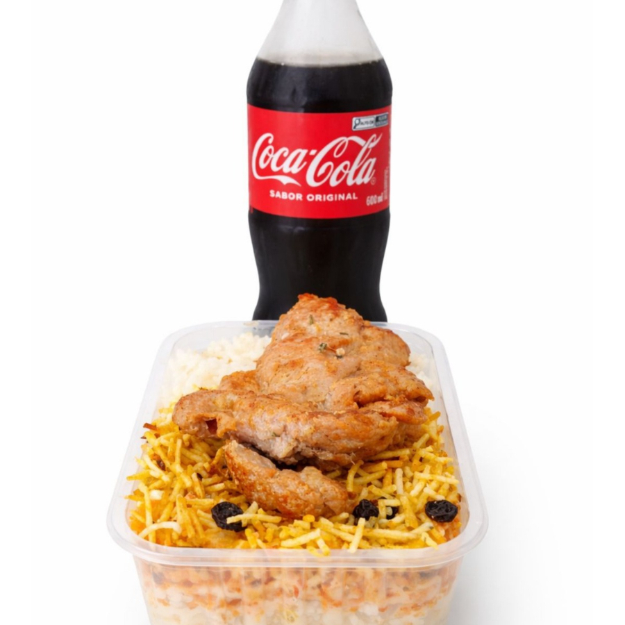 O salpicão completo inclui arroz e bife de pernil (Tam G - 700gr). Segue com coca cola a sua escolha, dentro das opções disponíveis.