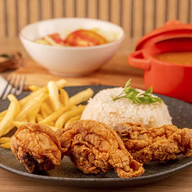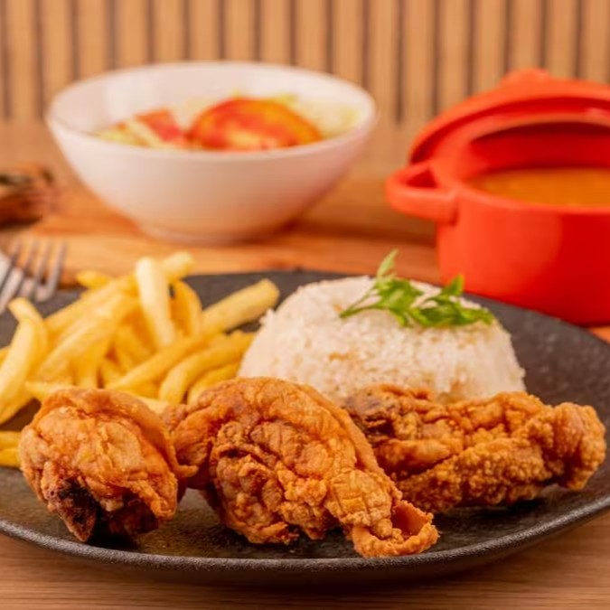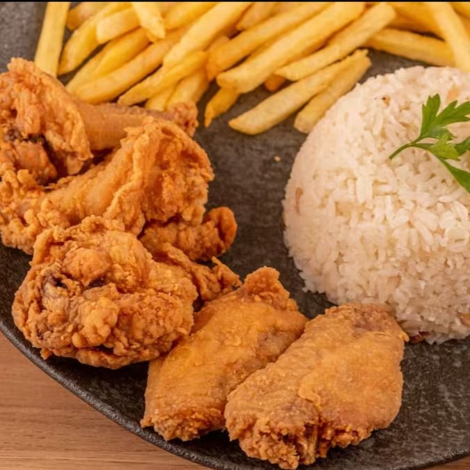O prato vem com 3 cortes de coxa e sobrecoxa e acompanhado com arroz, fritas, feijão e salada.