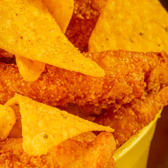 Deu Match! Balde P de tirinhas de Frango empanado na farinha do Doritos, acompanhado de Coca Mini e molho Barbecue.