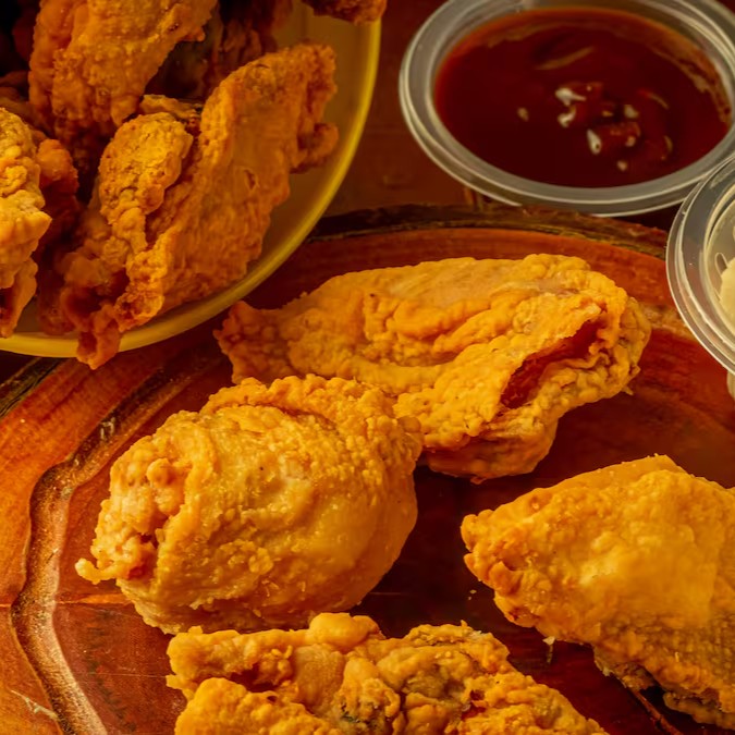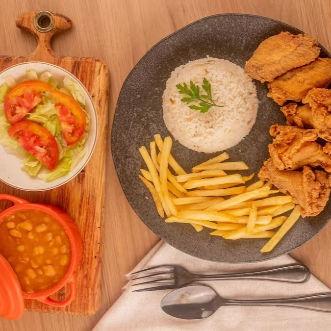 O prato acompanha arroz, feijão, batata frita, salada e 4 cortes entre tulipinhas e coxinhas da asa. Frango Frito