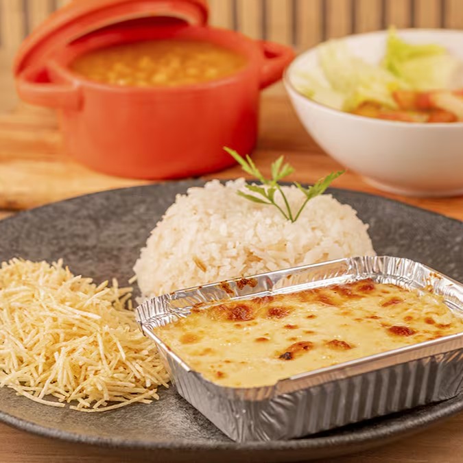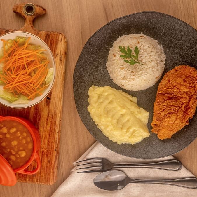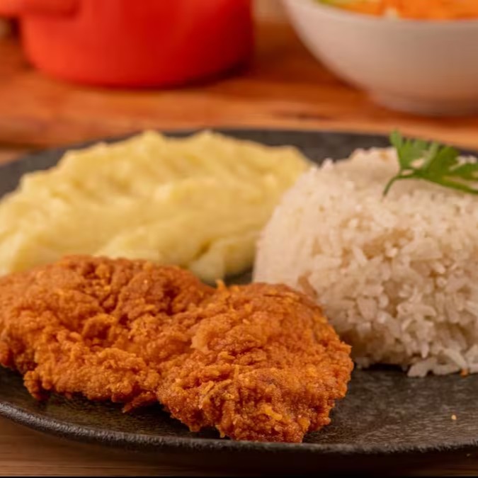 O prato acompanha : arroz , feijão , purê de batata e filé de frango empanado. Salada opcional!