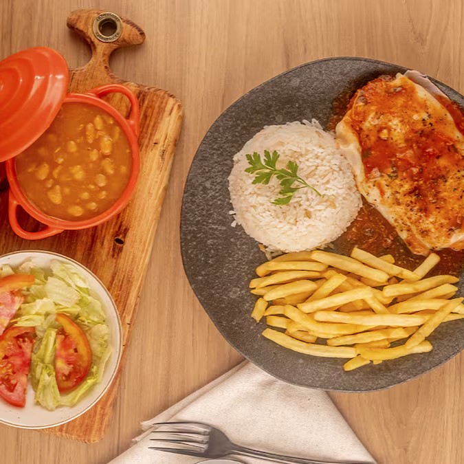 O prato acompanha, arroz, feijão, batata frita e 4 medalhões de frango! Salada Opcional!