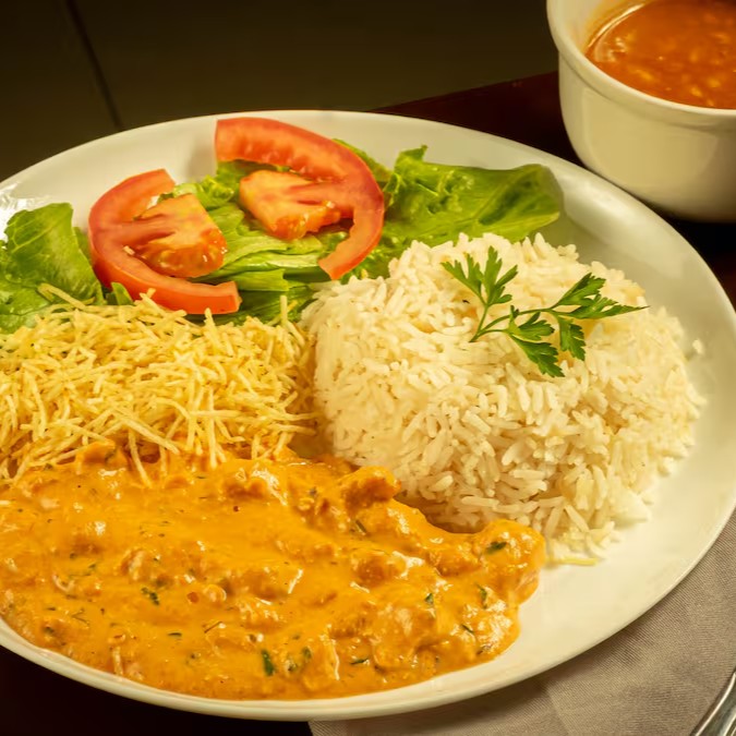 O prato acompanha : Arroz feijão, batata palha e um delicioso Fricassê de frango! Salada opcional