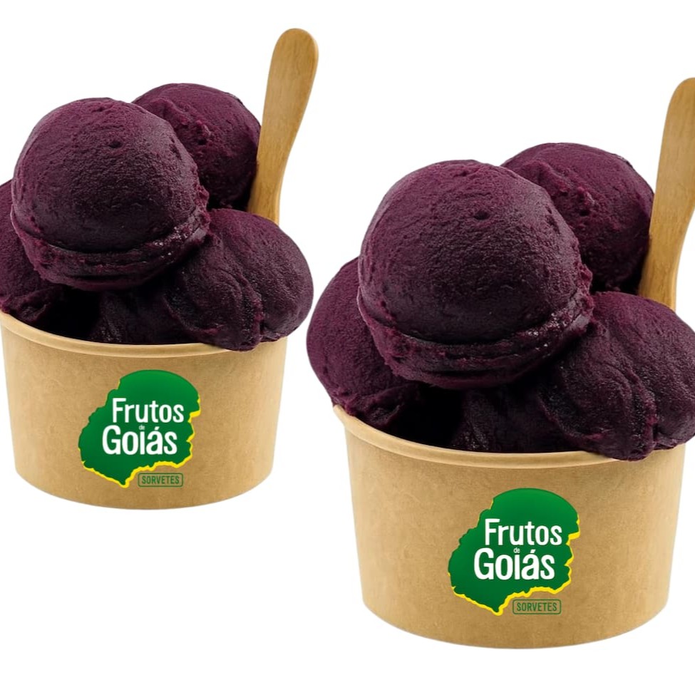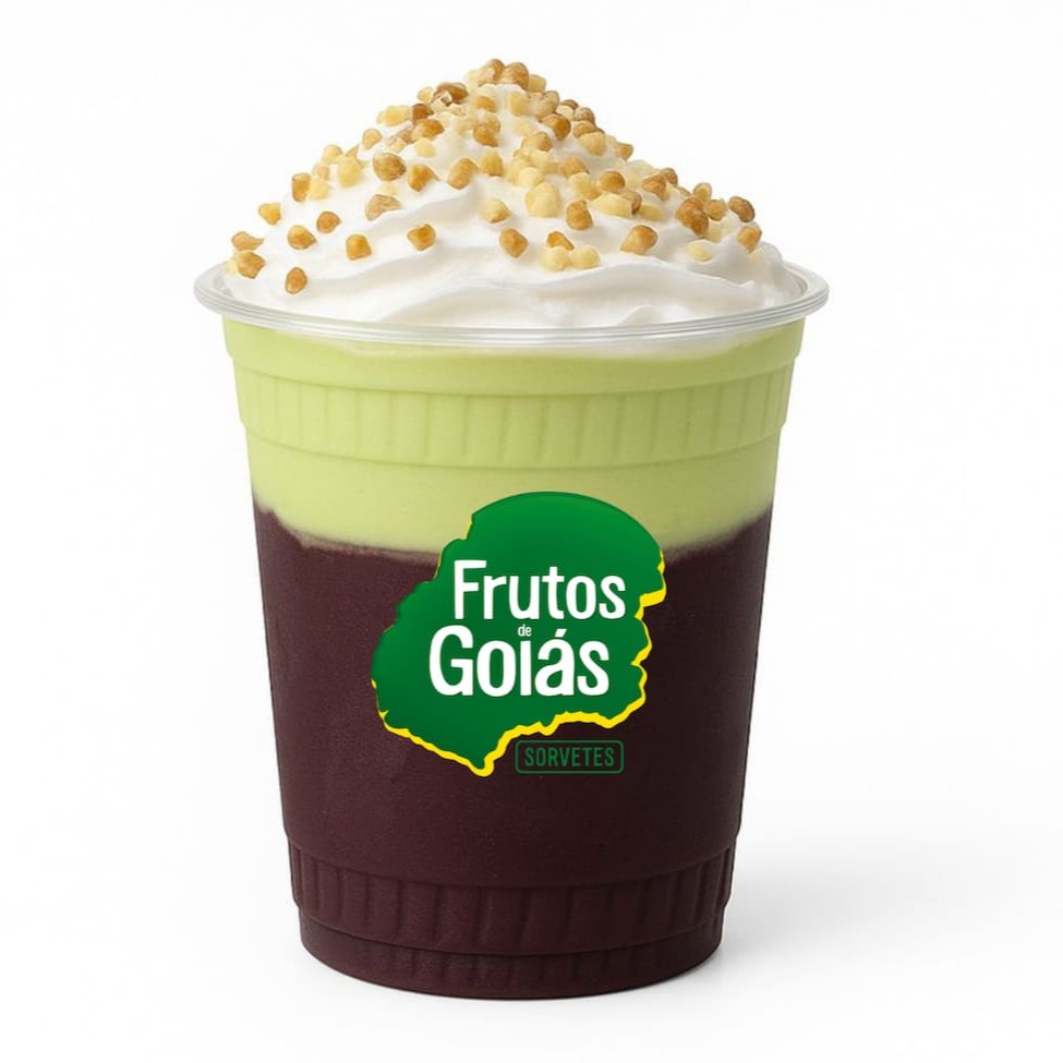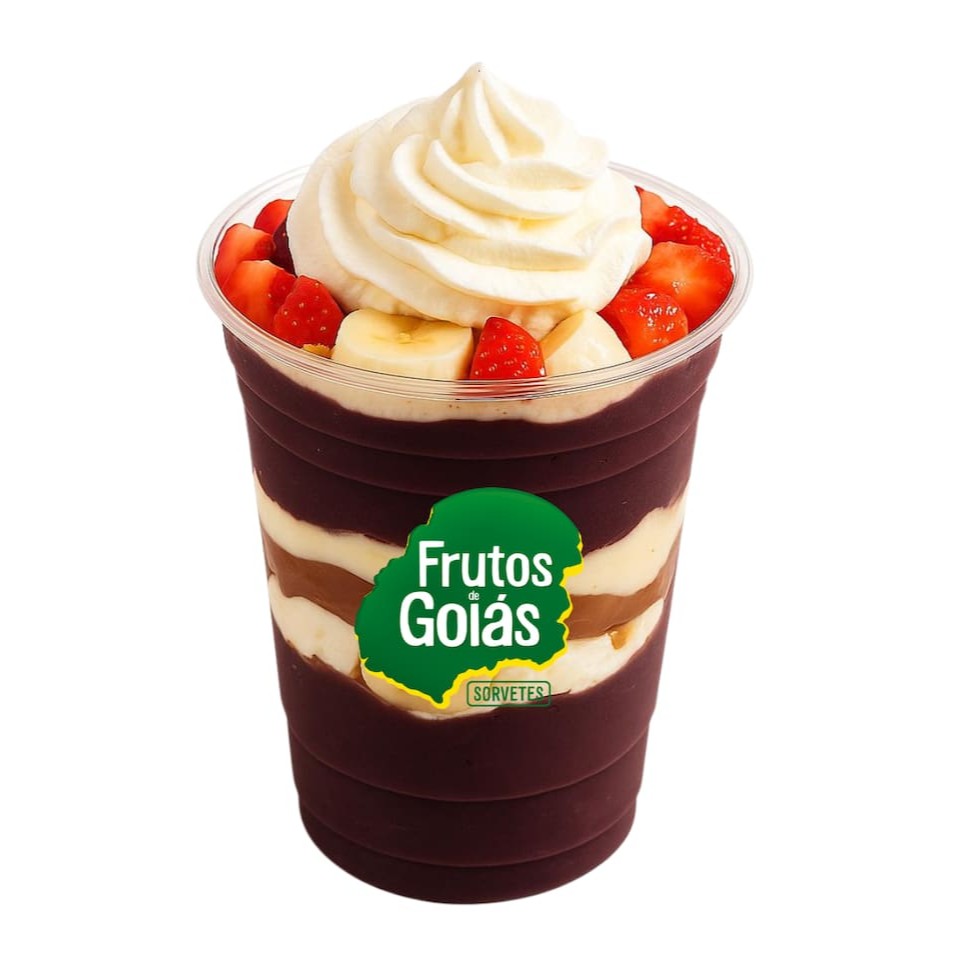 A combinação perfeita do açaí frutos de goiás com sorvete no pote de 360 ml com até dois complementos grátis adicionados ao pote de açaí.