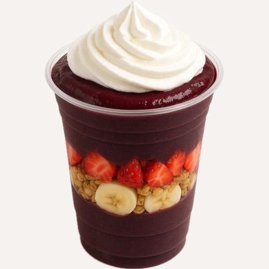 Seu delicioso açaí frutos de goiás no pote de 300 ml com seus complementos preferidos coroado com o delicioso chantily em três versões diferentes.