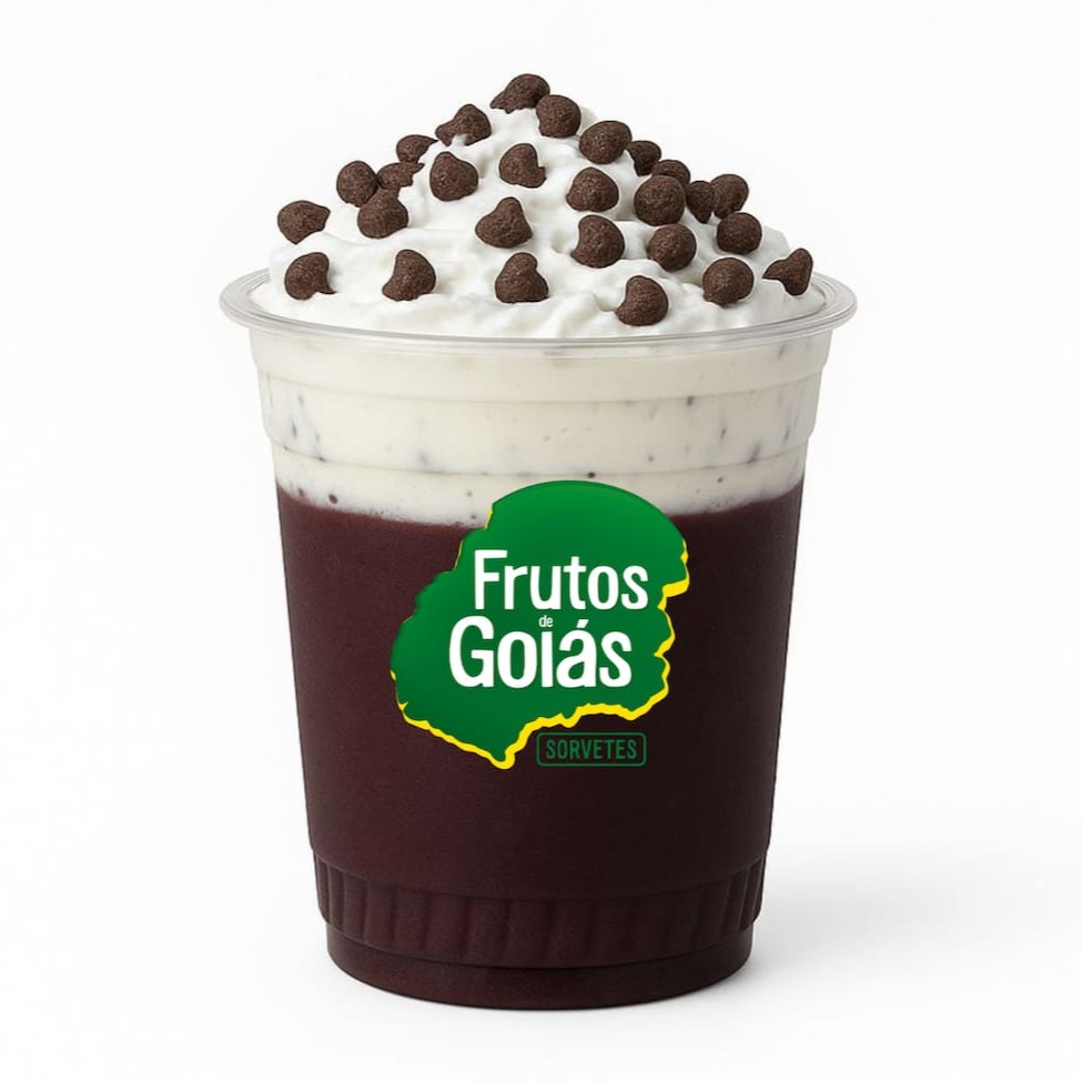 Seu açaí Frutos de Goiás em uma irresistível versão com cookie, finalizado com creme de cookie e chantilly proporcionando uma incrível cremosidade ao seu produto