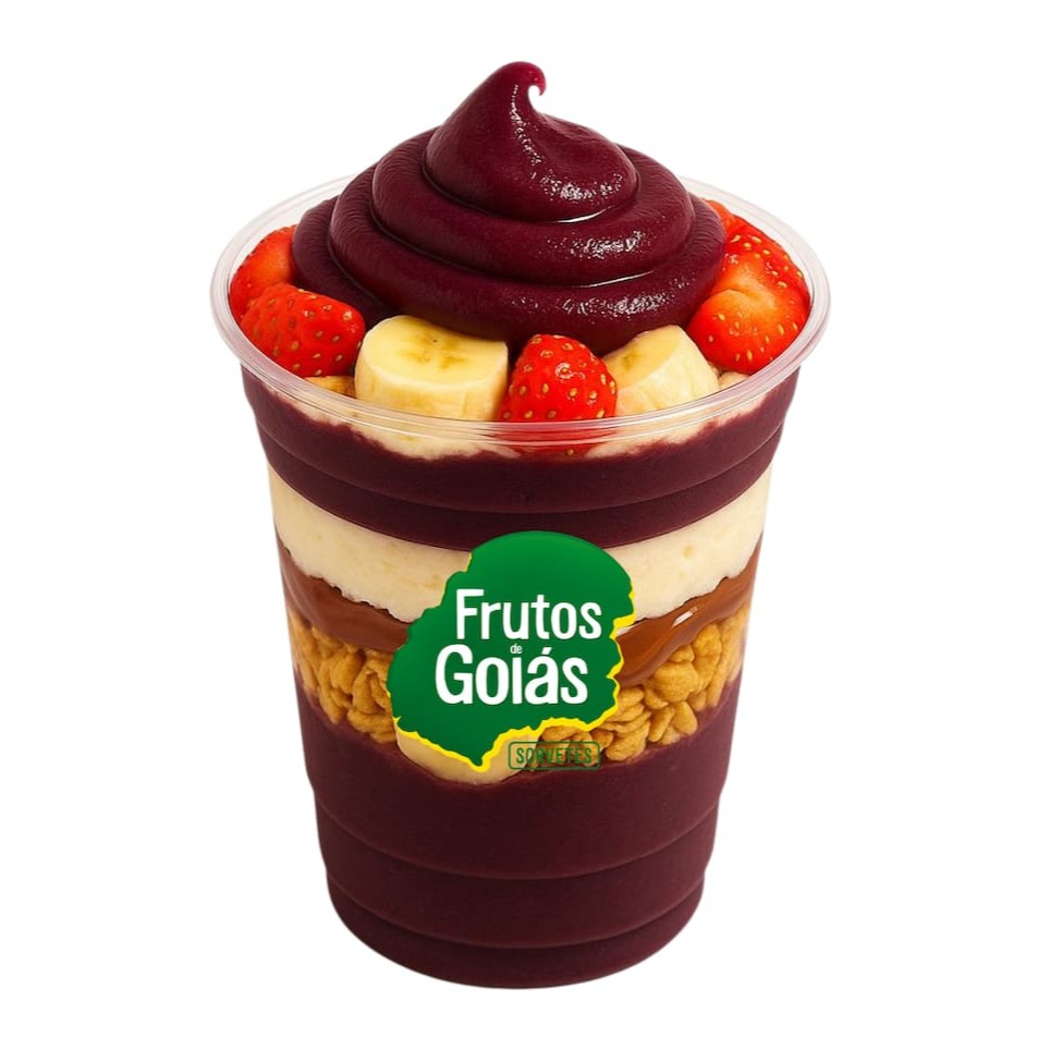 Seu delicioso açaí frutos de goiás no pote de 480 ml com dois complementos grátis adicionados ao pote do açaí.