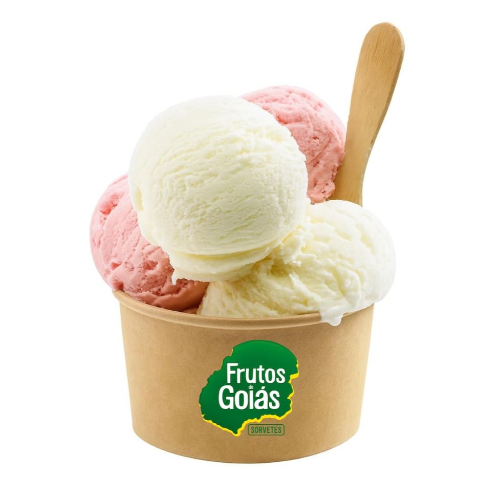 Seu delicioso sorvete frutos de goiás na opção a granel no pote de 360 ml e com complementos adicionais embalados separadamente.