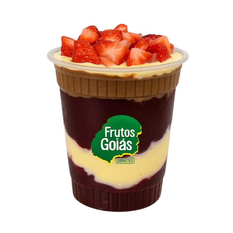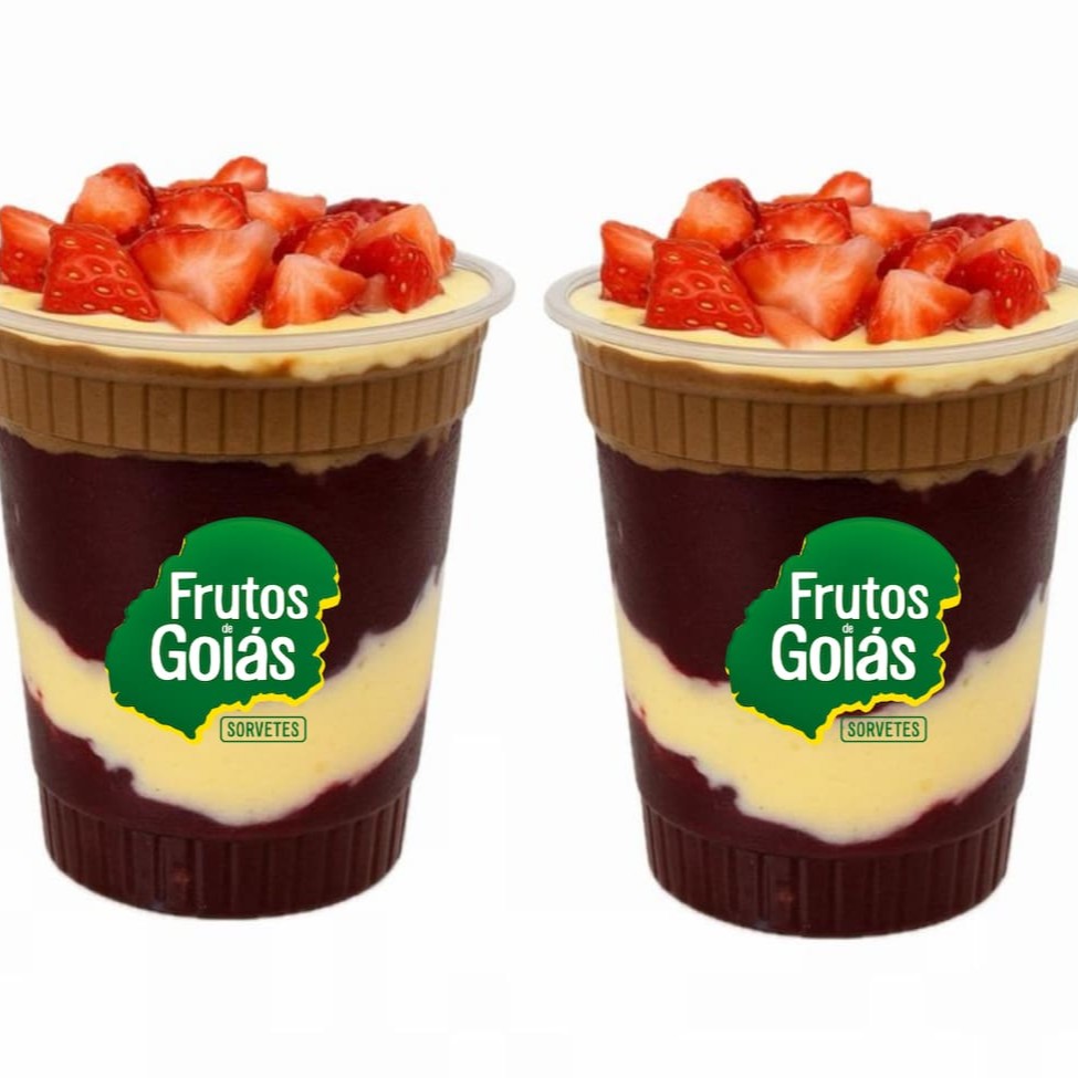 A combinação perfeita do açaí frutos de goiás com sorvete no pote de 360 ml com até dois complementos grátis adicionados ao pote de açaí.