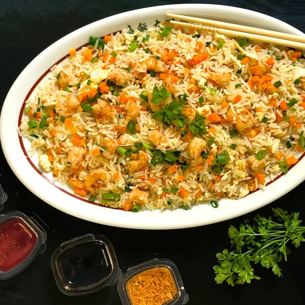 Arroz branco, camarão, cenoura em cubos, ovos mexidos e cebolinha e Salsa.